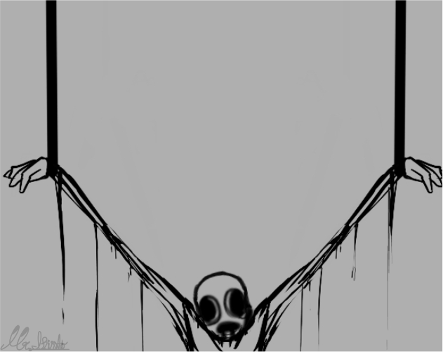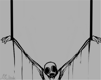 | This is a monochrome horror illustration featuring a distorted, organic creature. | |