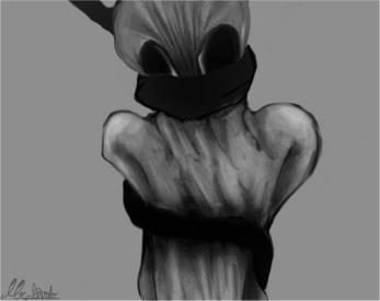 | This is a monochrome horror illustration featuring a distorted, organic creature. |